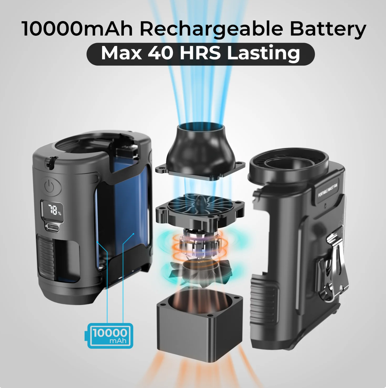 Waist Clip Fan, Neck Fan, Personal Fan, Portable Power Bank, and LED Torch all in one.